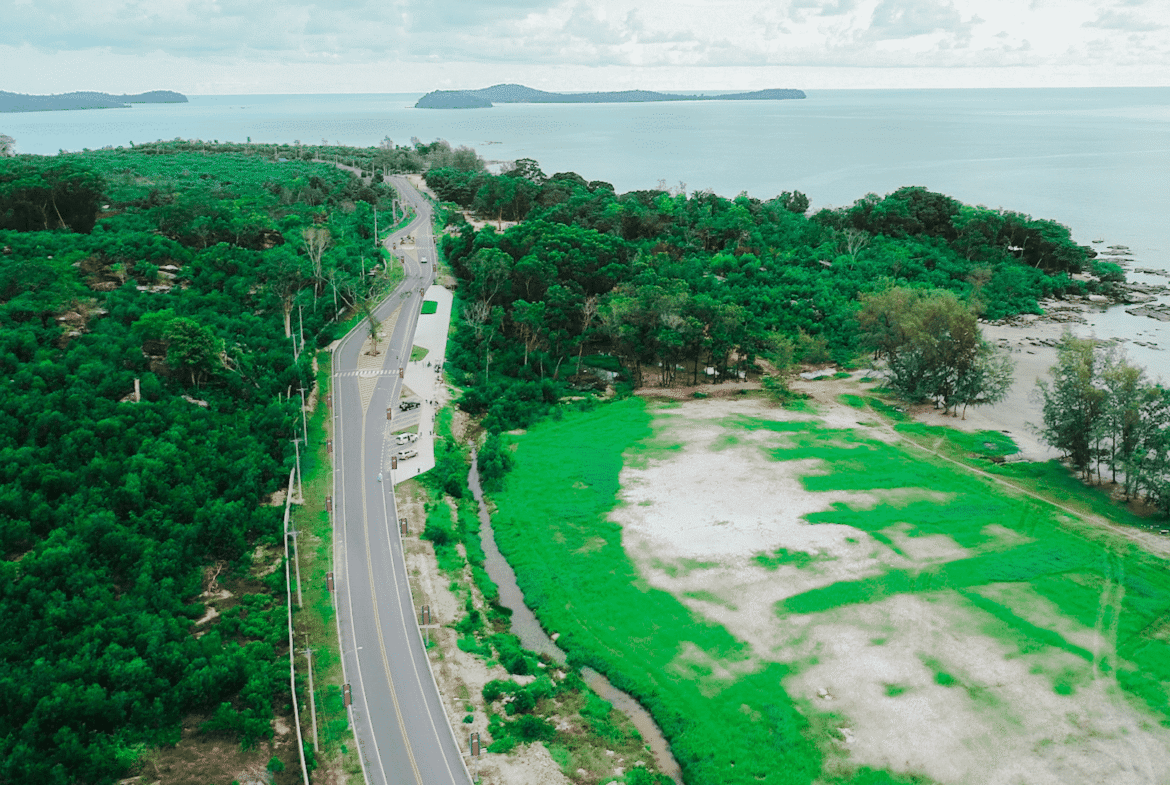⭕️ The land is located at the peak point, overlooking several popular tourist attractions, such as the Preah Thong Neang Neak Statue, Bay of Light ($10 billion coastal development project spanning 934 hectares in Ream City), Khmer Can Do Billboard, Deum Chheur Cham Sne Tree, and Otres Beach, etc.